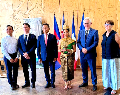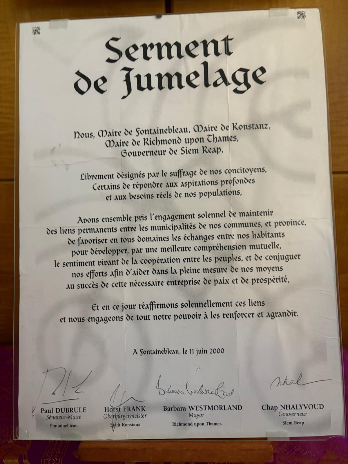 Unecérémonie officielle à la mairie de Fontainebleau, en présence de nombreuses personnalités : l’ambassadeur du Cambodge accompagné d’autres diplomates, le maire de Fontainebleau, la présidente de l’APJFA, et Monsieur Cherrier, proviseur du lycée François Couperin.