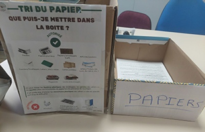 L’installation de boîtes de récupération de papiers usagés et de cartouches à jet d’encre pour leur valorisation au profit de la MDL en salle de reproduction, en vie scolaire, à l’administration, au CDI et dans les salles de cours et dans les laboratoires de physique/chimie.